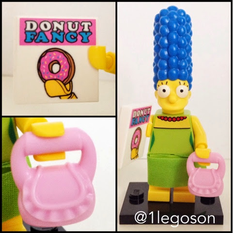 Marge's hair is awesome! She comes with a copy of Donut Fancy and a purse. Her red necklace is painted on the torso. Because of the weight of her hair, she can't really stand up without Lego studs holding her up.